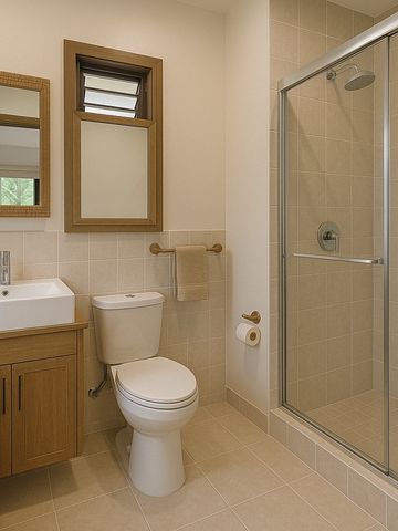 A bright, family-friendly bathroom featuring a sleek vanity, glass shower, and warm tiled finishes, blending functionality with modern island style